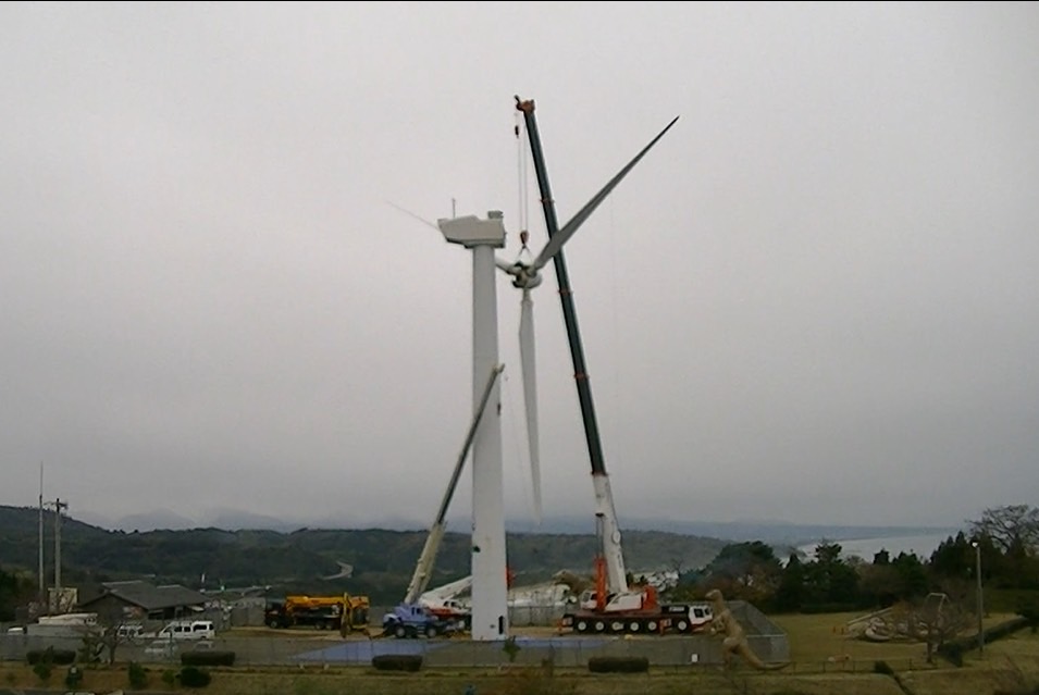 大型解体となる風車解体では、(株)晃進様の下請けとして、(株)ウエヤマ様のご協力のもと解体を行いました。